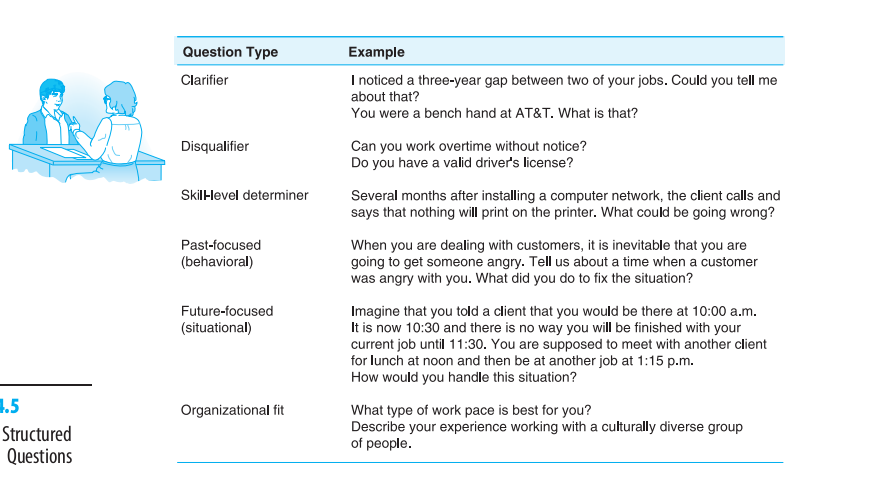 Now that you have your list of essential KSAO's the next step is to actually write questions that will use those tapped KSAO's. Figure 4.5 on page 142 of your text discusses the different types of questions used in a structure interview. Using this figure as a guide write two examples of each type of interview question making sure you cover all of the essential KSAO's you listed in part 1.