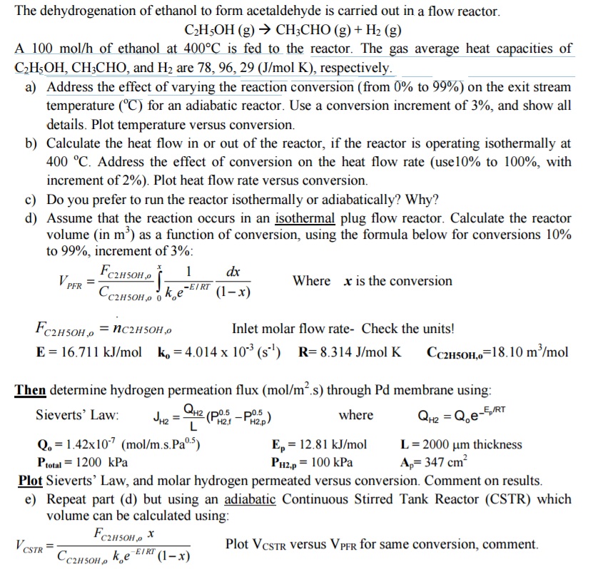 P.“ = 1200 kPa Pm, = 100 kPa A5 347 cm2 Plot Sieverts’ Law, and molar hydrogen permeated versus conversion. Comment on results. e) Repeat part (d) but using an adiabatic Continuous Stirred Tank Reactor (CSTR) which