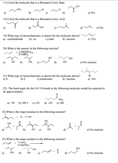 a] E h] I e}elrarltion1er d] raeemie e] NA 2’1]'l'hebondangiefortheD-C-Nbornkirifliefoliowingmoleeulewmfldbeexpeetedto be approximately: D WJI“ NH: :1190 ‘njlflqj e112!) d}l45 ejlflfl 24] 1What is The major product to the following reoefiori‘? flfikfi“ M Aw W 0H e] 9H d] E] 1|What is The major product to the following reaction?