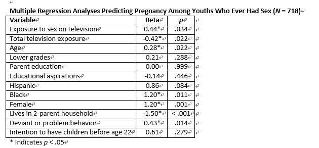whether they had become pregnant (females) or had made another person pregnant (males). Below is a table showing the results of their multiple regression analyses.