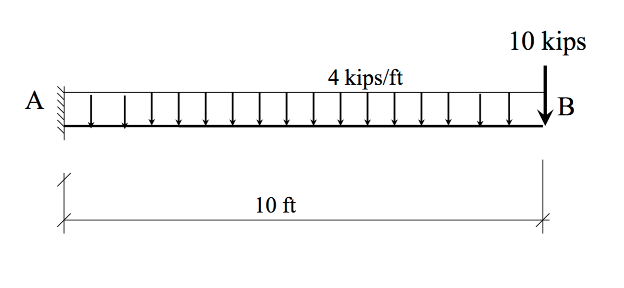 For the cantilever beam given below use Virtual Work to determine the displacement at B. Use Castigliano’s 2nd Theorem to find the slope at B. Check the displacement at B using Castigliano’s 2nd Theorem. Moment of inertia I and modulus of elasticity E are constant.