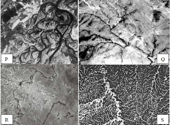 Drainage patterns observed in four areas are shown in black-and-white panchromatic images P, Q, R and S. Field work in these areas has indicated presence of the following lithology/geological unit. 1. Fractured quartzite 2. Shale 3. Limestone 4. Alluvial plain The correct match of the drainage patterns with the lithology/geological unit is (A) P-1; Q-2; R-4; S-3 (B) P-4; Q-1; R-3; S-2 (C) P-4; Q-1; R-2; S-3 (D) P-2; Q-1; R-3; S-4