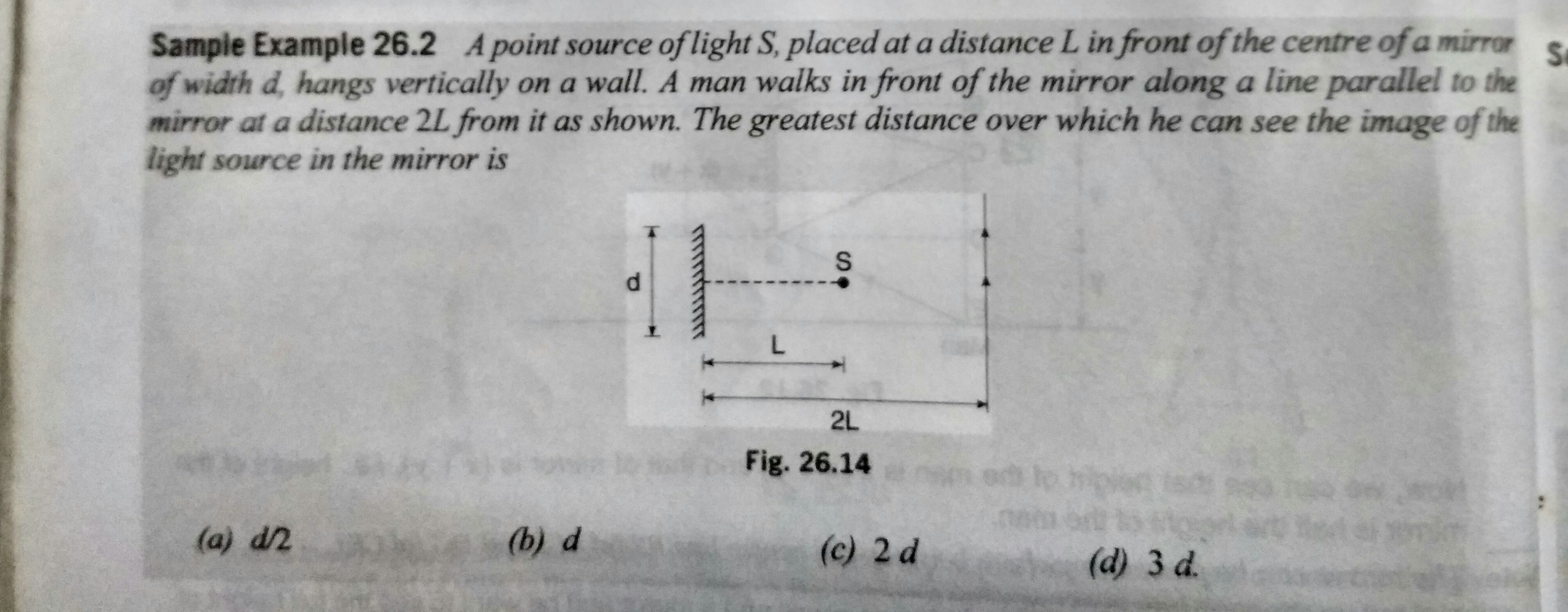 A point source of light S, placed at a distance L in front of the center of a mirror of width d, hangs vertically on a wall. A man walks in front of the mirror along a line parallel to the mirror at a distance 2L from it. What is the greatest distance over which he can see the image of the light source in the mirror?