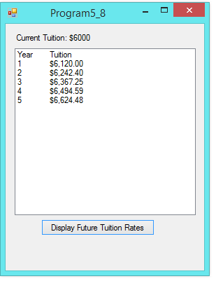 At one college the tuiton for a full-time student is $6000 per semester. It has been announced that the tuition will increase by 2 percent each year for the next five years. develop an application with a loop that displays the projected semester tuition amount for the next 5 years in a ListBox control. Attached is a copy of what the program should look like as well as an executable for the demo.