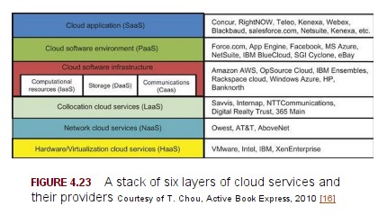 You have read a number of success or failure stories on cloud computing applications by startup entrepreneurs or established IT companies. In Chou’s introductory book on business computing [18], six categories of cloud services are identified, as listed here and shown below and also in Figure 4.23. Software Applications (SaaS): Concur, RightNOW, Teleo, Kenexa, Webex, Blackbaud, Salesforce.com, Netsuite, Omniture, Kenexa, Vocus Platform Services (PaaS): Force.com, App Engine, Postini, Facebook, MS Azure, NetSuite, IBM RC2, IBM BlueCloud, SGI Cyclone, eBay, Pitney Bowes Infrastructure Services (SaaS): Amazon AWS, OpSource Cloud, IBM Ensembles, Eli Lily, Rackspace cloud, Windows Azure, HP, Bank North, New York Times Collocation Services( LaaS): Savvis, Internap, NTTCommunications, Digital Realty Trust, 365 Main Network Cloud Services (NaaS): Owest, AT& T, AboveNet Hardware/ Virtualization Services (HaaS): VMware, Intel, IBM, XenEnterprise Pick one company. Dig into the company services in detail, contact the company directly, or visit their web sites. The purpose is to report on their innovations in cloud technology, good business ideas implemented, software application development, business models they have developed, and success/ failure lessons learned.