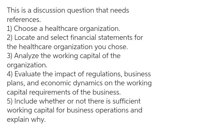 This is a discussion question that needs references. 1) Cheese a healthcare organization. 2] Locate and select financial statements for the...