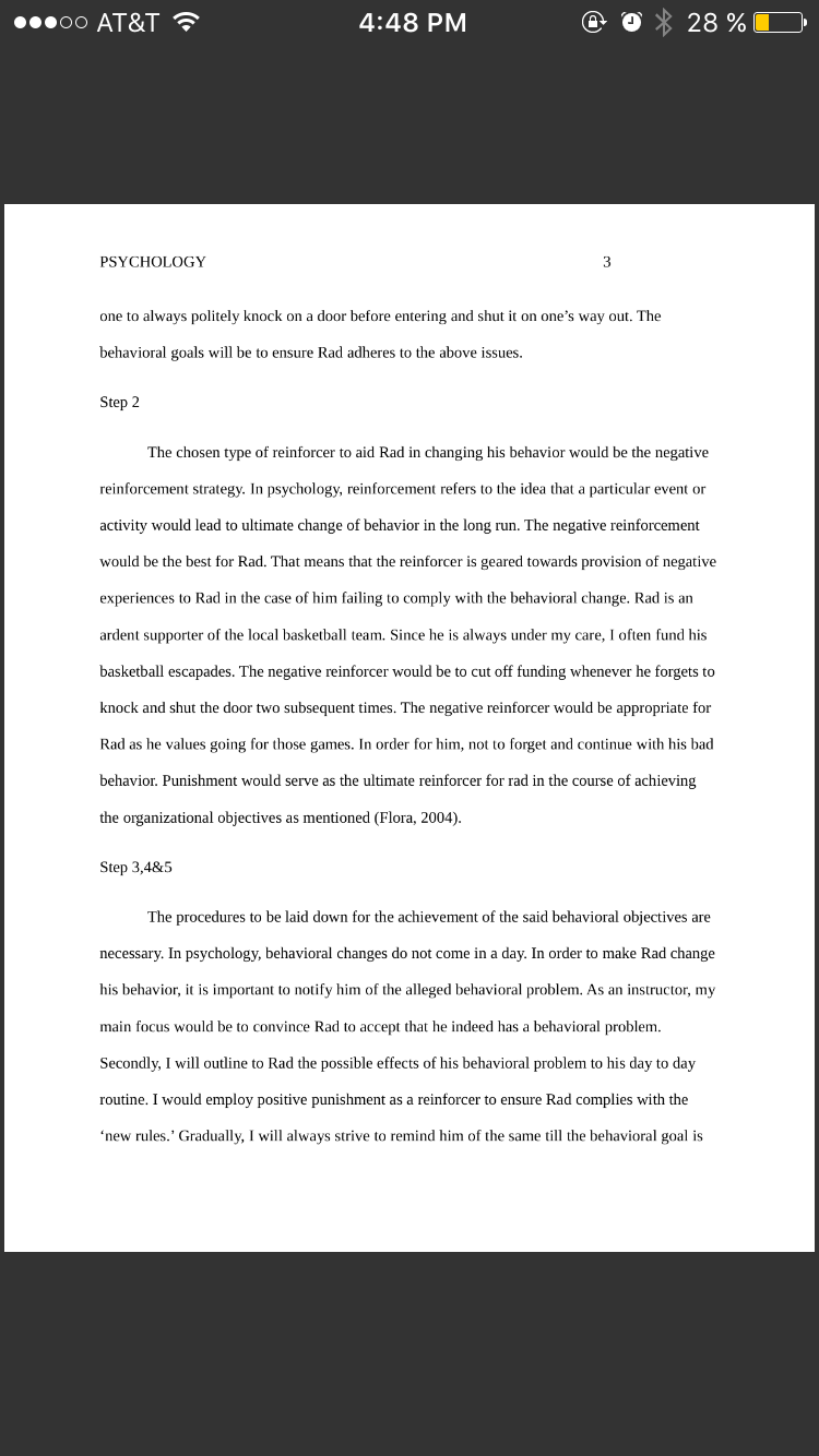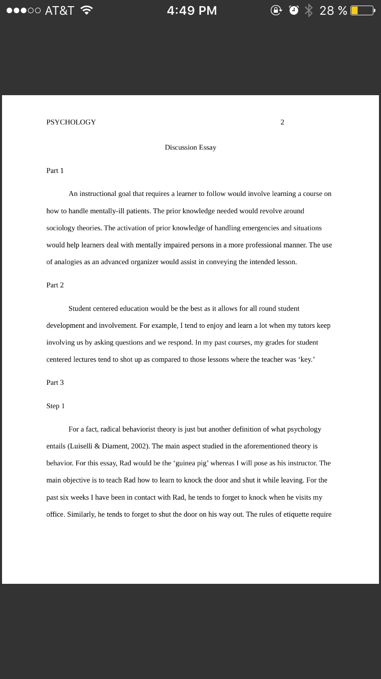 · Assignment #2: Interacting with Rad Relying on both textural information and at least two (2) outside references, write a three to five (3-5) page report that answers the following: 1. Describe the behavioral goal you set for Rad in Assignment #1. 2. Choose either Bruner’s or Vygotsky’s Theory of cognitive development, and explain the fundamental tenets of the chosen theory. 3. Describe the key ways that the approach to the desired goal would change with the chosen theory. Explain the assumptions to the chosen theory and the manner in which they may impact Rad or you as the Instructor. The format of the report is to be as follows: · Typed, double spaced, Times New Roman font (size 12), one inch margins on all sides, APA format. · Use headers for each of the subjects being covered, followed by your response. · In addition to the three to five (3-5) pages required, a title page is to be included. The title page is to contain the title of the assignment, your name, the instructor’s name, the course title, and the date. Note: You will be graded on the quality of your answers, the logic/organization of the report, your language skills, and your writing skills. Outcomes Assessed: · Analyze the basic principles of learning theories. · Analyze how cognitive development influences learning ability and styles. · Use technology and information resources to research issues in. Points: 200 Assignment 2: Interacting with Rad Criteria Unacceptable Below 70% F Fair 70-79% C Proficient 80-89% B Exemplary 90-100% A 1. Describe the behavioral goal you set for Rad in Assignment #1. Weight: 15% Did not submit or incompletely met the stated criteria. Partially met the stated criteria. Satisfactorily met the stated criteria. Thoroughly met the stated criteria. 2. Choose either Bruner’s or Vygotsky’s Theory of cognitive development, and explain the fundamental tenets of the chosen theory. Weight: 30% Did not choose or incompletely met the stated criteria. Partially met the stated criteria. Satisfactorily met the stated criteria. Thoroughly met the stated criteria. 3. Describe the key ways that the approach to the desired goal would change with the chosen theory. Explain the assumptions to the chosen theory and the manner in it which they may impact Rad or you as the Instructor. Weight: 30% Did not submit or incompletely met the stated criteria. Partially met the stated criteria. Satisfactorily met the stated criteria. Thoroughly met the stated criteria. 4. 2 References Weight: 5% No references provided Does not meet the required number of references; some or all references poor quality choices. Meets number of required references; all references high quality choices. Exceeds number of required references; all references high quality choices. 5. Writing Mechanics, Grammar, and Formatting Weight: 5% Serious and persistent errors in grammar, spelling, punctuation, or formatting. Partially free of errors in grammar, spelling, punctuation, or formatting. Mostly free of errors in grammar, spelling, punctuation, or formatting. Error free or almost error free grammar, spelling, punctuation, or formatting. 6. Appropriate use of APA in-text citations and reference section Weight: 5% Lack of in-text citations and / or lack of reference section. In-text citations and references are provided, but they are only partially formatted correctly in APA style. Most in-text citations and references are provided, and they are generally formatted correctly in APA style. In-text citations and references are error free or almost error free and consistently formatted correctly in APA style. 7. Information Literacy / Integration of Sources Weight: 5% Serious errors in the integration of sources, such as intentional or accidental plagiarism, or failure to use in-text citations. Sources are partially integrated using effective techniques of quoting, paraphrasing, and summarizing. Sources are mostly integrated using effective techniques of quoting, paraphrasing, and summarizing. Sources are consistently integrated using effective techniques of quoting, paraphrasing, and summarizing. 8. Clarity and Coherence of Writing Weight: 5% Information is confusing to the reader and fails to include reasons and evidence that logically support ideas. Information is partially clear with minimal reasons and evidence that logically support ideas. Information is mostly clear and generally supported with reasons and evidence that logically support ideas. Information is provided in a clear, coherent, and consistent manner with reasons and evidence that logically support ideas.