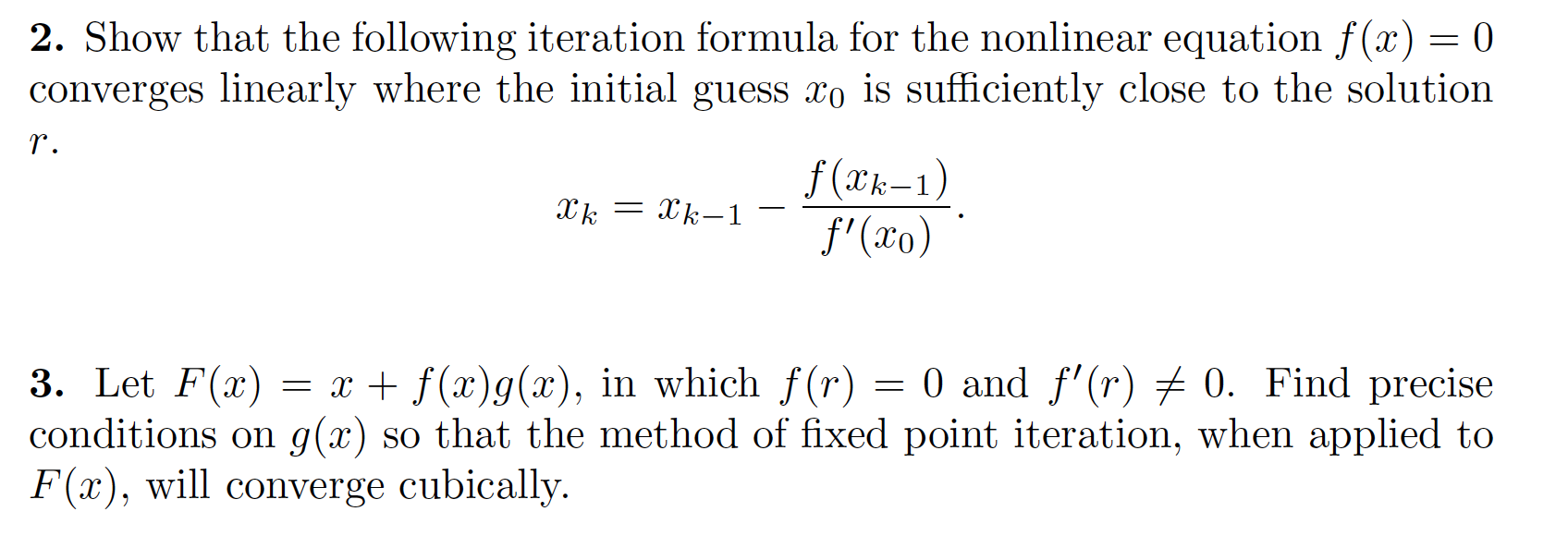 converges linearly where the initial guess 330 is sufficiently close to the solution T. firms—1) 37k: : 23k_1 — —. f’(fI30) 3. Let F(a:) 2 CC + f(a:)g(a:), in which f(7") = 0 and f’(?") 75 0. Find precise