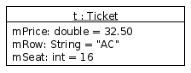 Suppose we are writing a program that will print tickets for an event. We will represent a ticket object by a class named Ticket. Each Ticket object will store three private instance variables: (1) mPrice which is a double; (2) mRow which is a String; (3) mSeat which is an int. For example, here is an object diagram for a Ticket object named t: