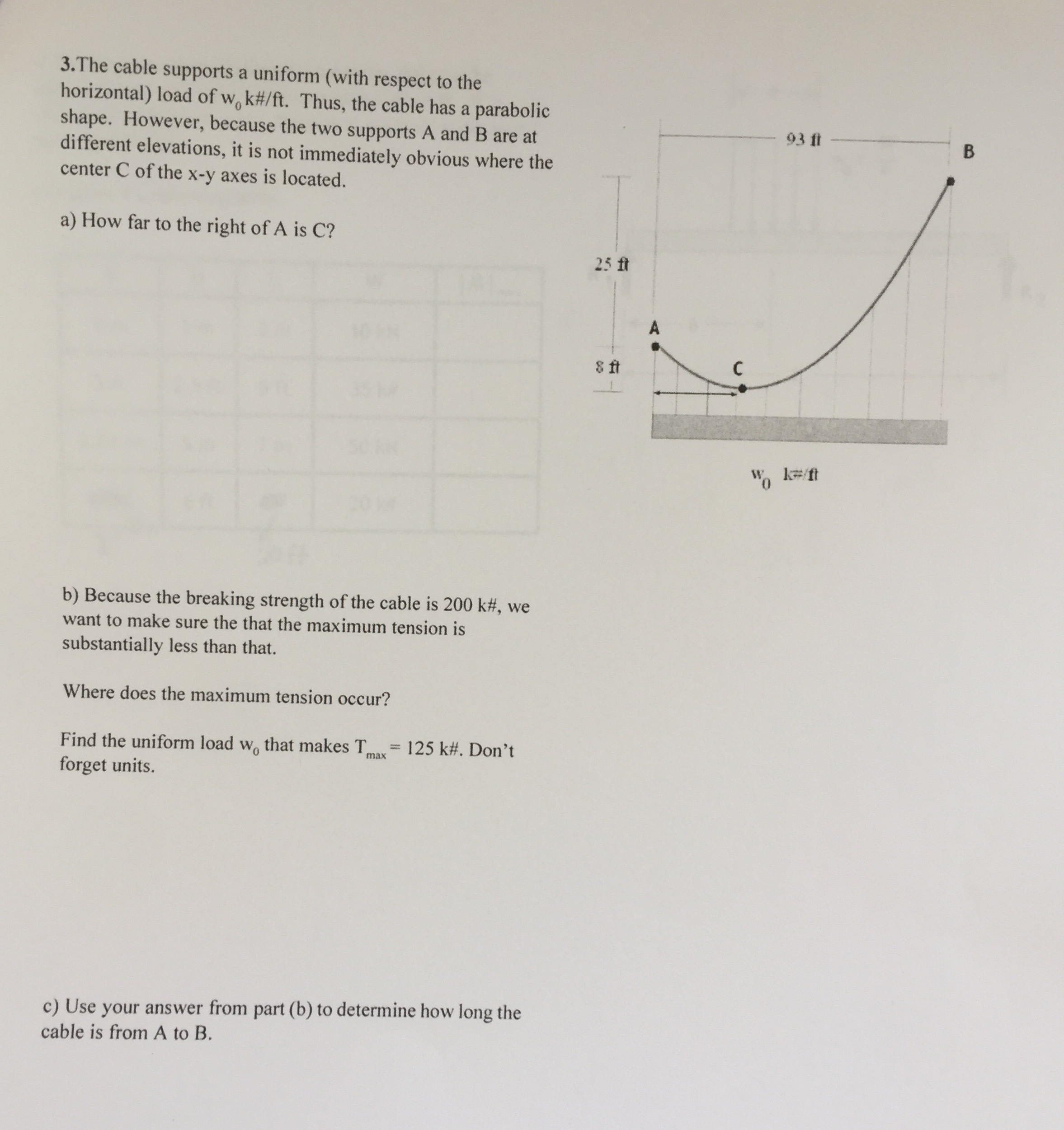 The cable supports a uniform (with respect to the horizontal) load of w0k#/ft. Thus, the cable has a parabolic shape. However, because the two supports A and B are at different elevations, it is not immediately obvious where the centre C of the x-y axes is located.