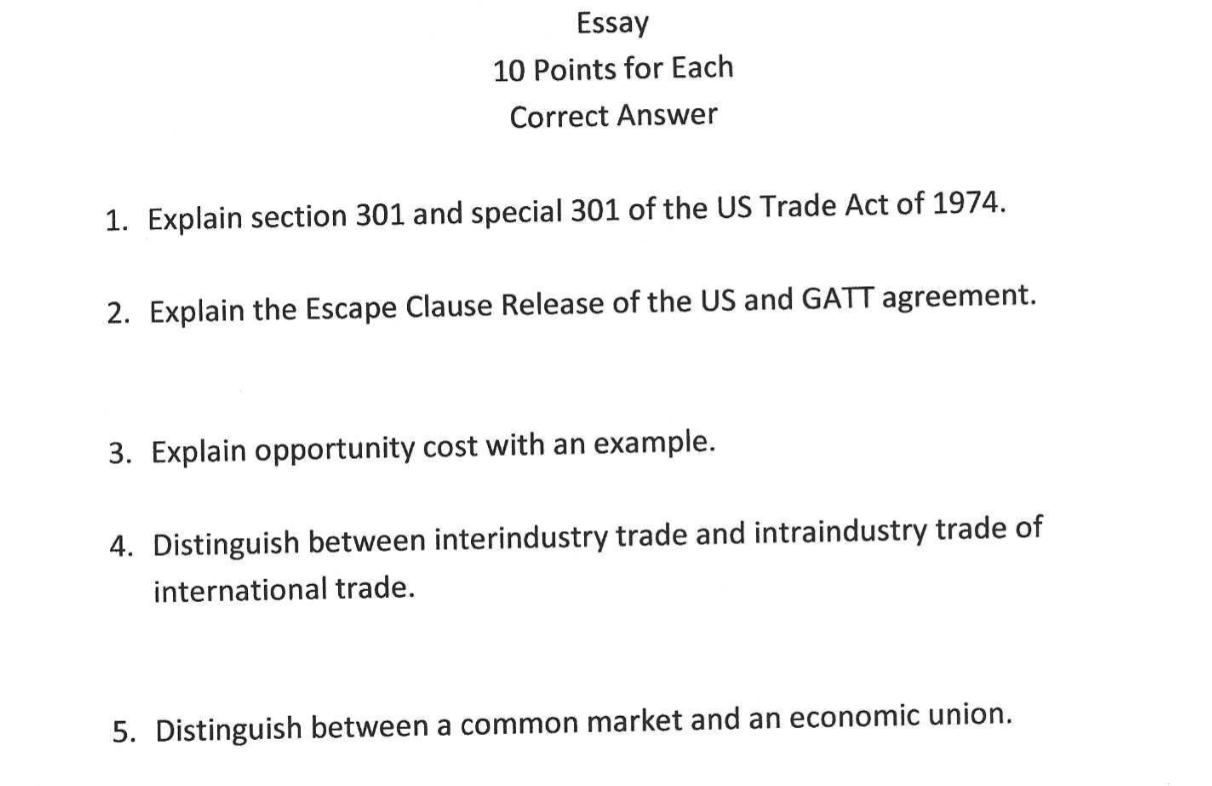 Correct Answer 1. Explain section 301 and special 301 of the US Trade Act of 1974. 2. Explain the Escape Clause Release of the US and GATT agreement. 3. Explain opportunity cost with an example. 4. Distinguish between interindustry trade and intraindustry trade of