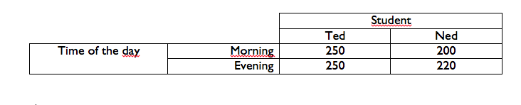 A psychologist decides to investigate helping behaviors. Two students will act as confederates in a staged procedure. One student, Ted, will wear torn and dirty clothes. The other student, Ned, will wear an expensive and clear suit and tie. The students will approach pedestrians on a busy street corner and ask for change either in the morning or in the evening. The table below indicates the amount of money (in dollars $) given to Ted and Ned at the two different times of day. Describe these results in your own words. Make sure to use the terms ‘main effects’ and ‘interaction’ in your description.