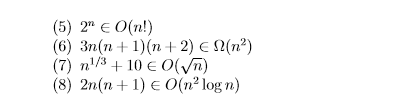 This exercise tests your understanding of asymptotic growth functions for describing algorithm efficiency in terms of the efficiency classes 'O' (upper bound), 'Ω' (lower bound) and 'Θ' (tight bound). If an efficiency function f(n) belongs to an efficiency class X(n) we write f(n) ∈ X(n), where X may be O, Ω or Θ.