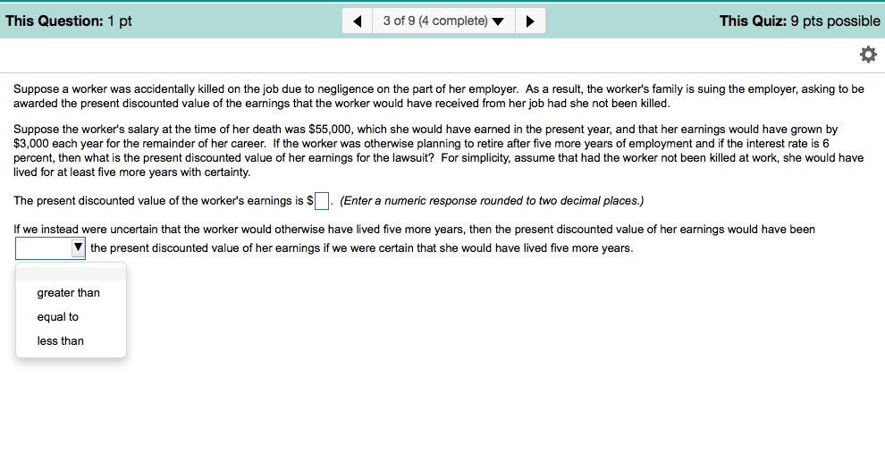awarded the present discounted vahe ofthe eamings that the worker would have received from herjob had she not been killed. Suppose the worker’s salary at the time of her death was $55,000, which she muld have earned in the present year, and that her earnings would have grown by