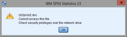 I am having trouble with the SPSS software for my statistical methods psychology class (PSY 3204). I have a mac computer btw. I am trying to save my output files to turn in at the end of the semester. Every time I try to save or export the a file I get an error message that says "Cannot access this file. Check security privileges over the network drive." I have tried making changes with the privacy settings on my computer, but nothing has worked. Am I doing something wrong or is there an easier way to save files with this software? Thanks!!