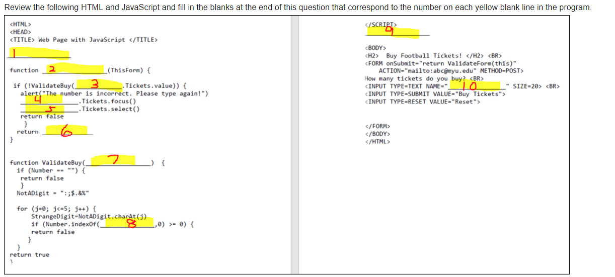 Review the following HTML and JavaScript and fill in the blanks.