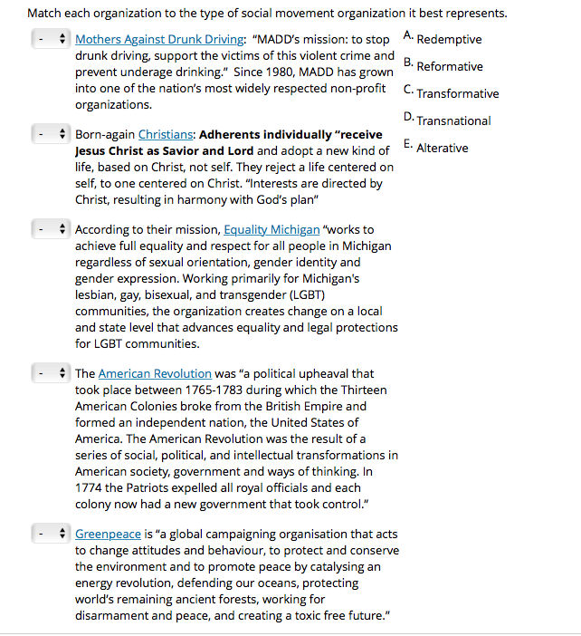 lvlatch each organization to the type of social movement organization it best represents. I.