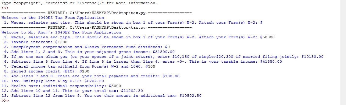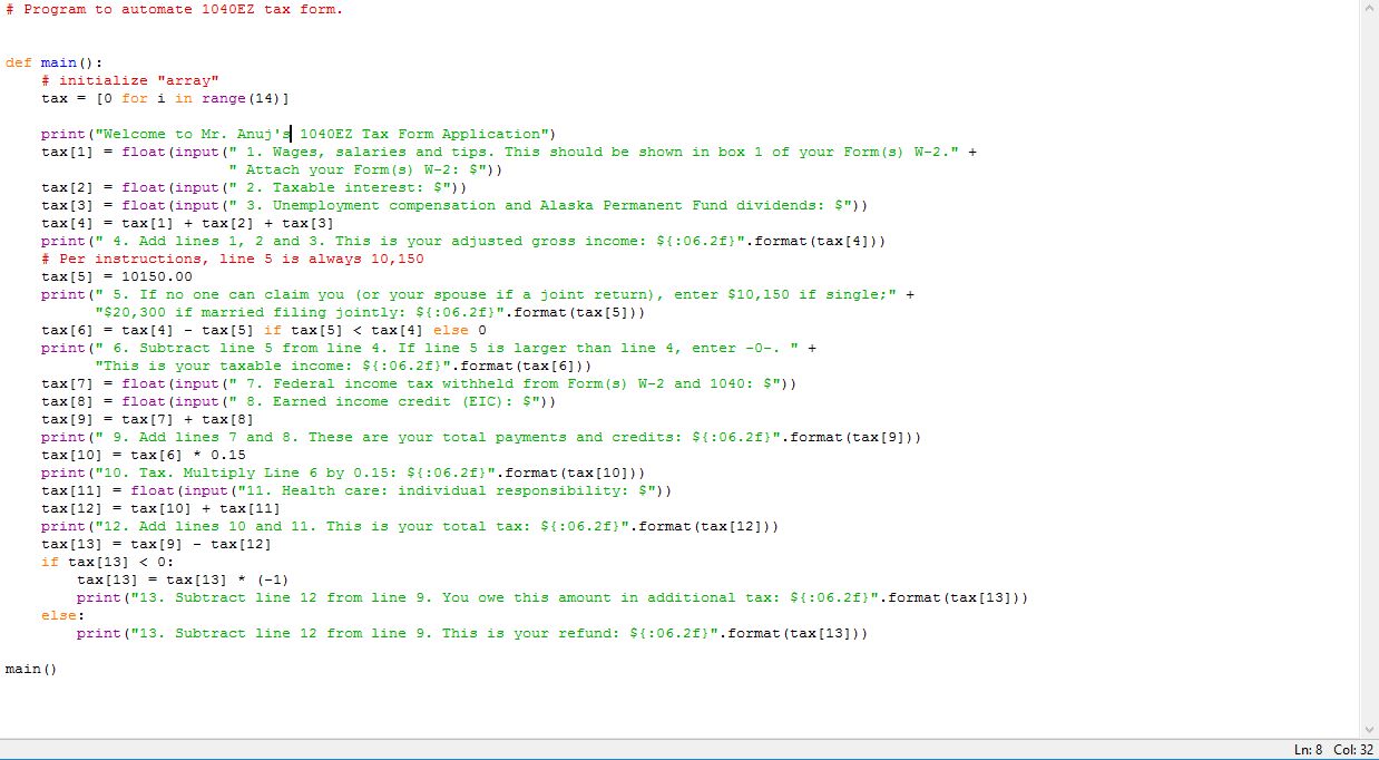 You will make a program to allow the user to complete the 1040EZ form. You will notice that some lines on the form require the user to enter information. See lines 1, 2, 3, 7, 8, and 11. Other lines are calculations, which your program needs to perform for the user. See lines 4, 5, 6, 9, 10, 12, 13, and 14.