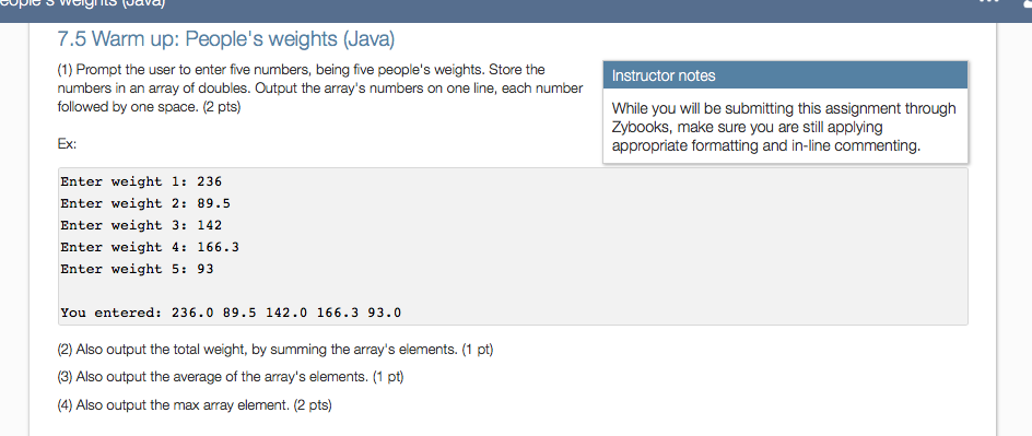 (1) Prompt the user to enter five numbers, being five people's weights. Store the numbers in an array of doubles. Output the array's numbers on one line, each number followed by one space. (2 pts)Â