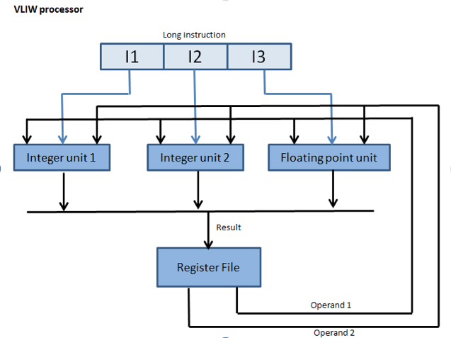 Shown below is a VLIW system in which each long instruction word generated by the compiler is a packet or bundle of three individual machine operations. The hardware system contains two integer units and one floating point unit. Therefore, up to 2 integer operations and 1 floating point operation can be performed in parallel in the same clock cycle. However, due to the mix of available instructions and possible dependencies, the system may not be able to make use of all the execution units for a particular cycle. In that case, the compiler would insert one or more nops into the instruction bundle (i.e., into the long instruction word) to fill any unused slots.