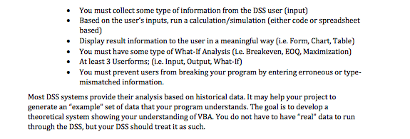 Hello Please See Attachment. I need a project to be created with these guidelines. I need this to be coded in VBA. The idea that this project would revolve around is creating a schedule building application for college students. The inputs could be number of credits, time throughout the day etc. If you have any questions please let me know or if you have a better idea please share with me. I need this to be done thoroughly and efficiently. I will be giving a BIG TIP if the work is done effectively.