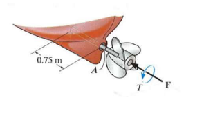 The solid propeller shaft on a ship extends outward from the hull. During operation at a certain speed, it experiences a torque of 60 kN.m. This causes a thrust of F = 1.23 MN on the shaft. If the shaft has a diameter of 250 mm, determine (a) the principal stresses on the surface of the shaft and show these on an element which is correctly oriented with respect to the shaft axis; and (b) the maximum in-plane shear stress and co-existing normal stress at any point located on the surface of the shaft and show these stresses on an element which is correctly oriented with respect to the axis of the shaft.