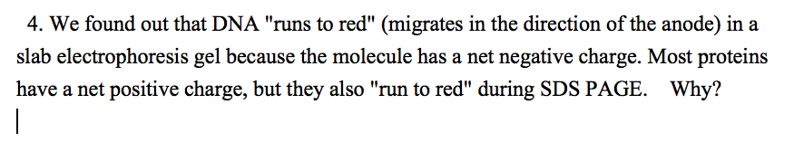We found out that DNA "runs to red" (migrates in the direction of the anode) in a slab electrophoresis gel because the molecule has a net negative charge. Most proteins have a net positive charge, but they also "run to red" during SDS PAGE. Why?