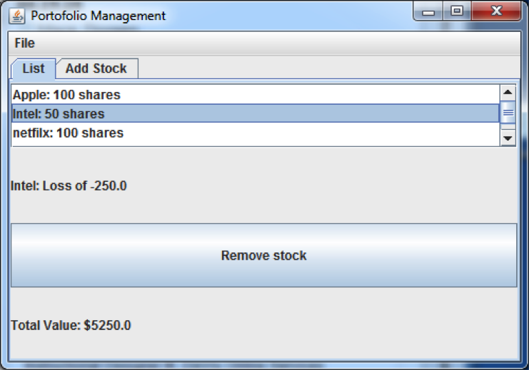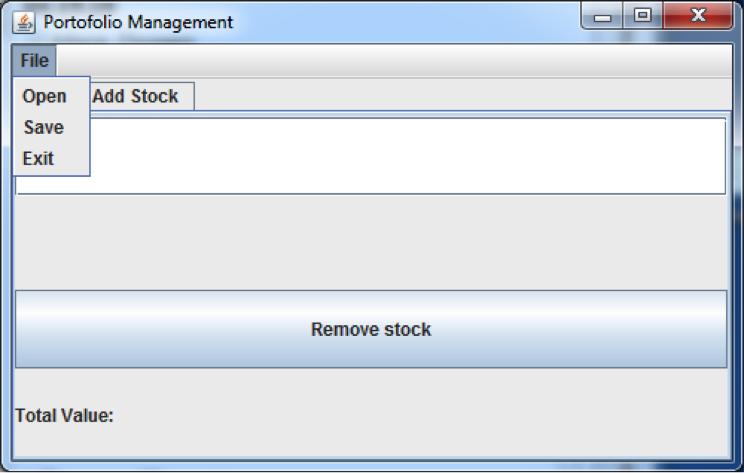 · Total value is updated whenever any changes are made to stocks (add, remove, open a new file).