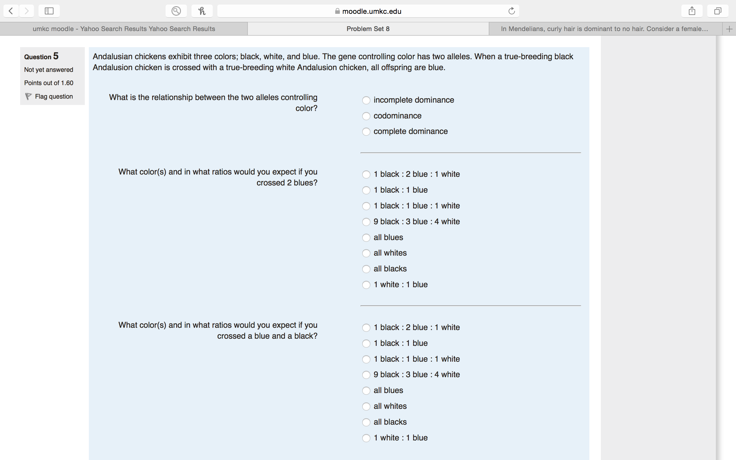 Andalusian chickens exhibit three colors; black, white, and blue. The gene controlling color has two alleles. When a true-breeding black Andalusion chicken is crossed with a true-breeding white Andalusion chicken, all offspring are blue.