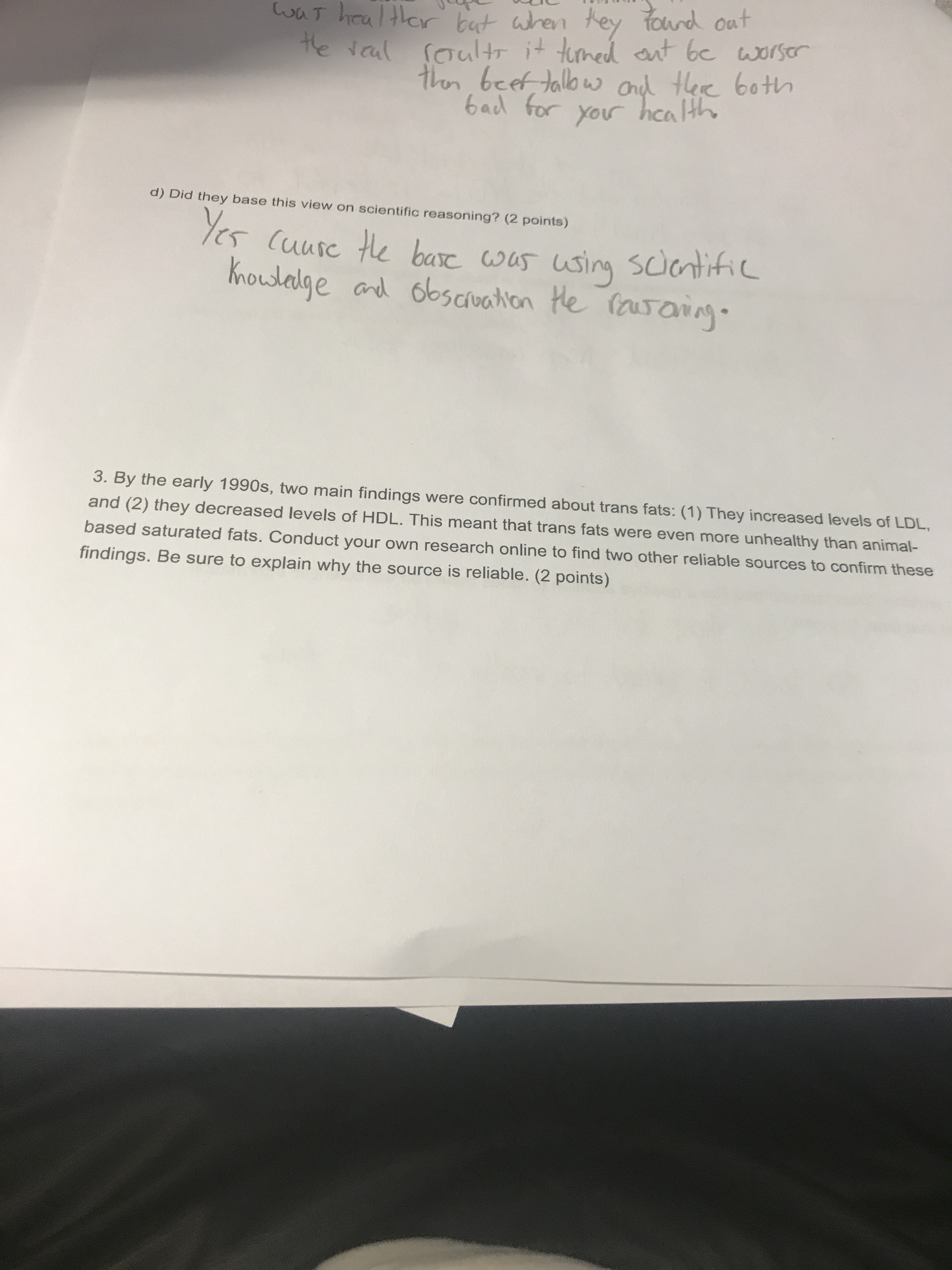By the early 1990s . Two main findings were confirmed about trans fats (1) they increased levels of LDL and (2) they decreased levels of HDL. This meant that trans fats were even more unhealthy than animal based saturated fats. Conduct your own research online to find two other reliable sources to confirm these findings. Be sure to explain why the source is reliable