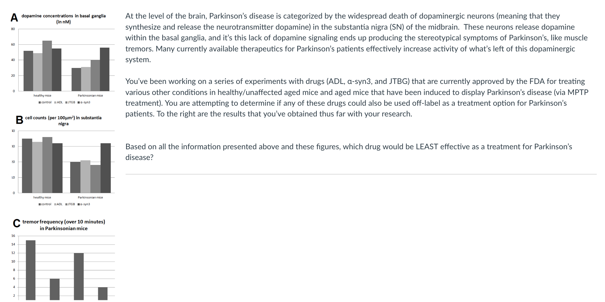 Please help me answer the below neurobiology question based on the given figures. Select the option that BEST fits with a mechanism of action for ADL. Then, Explain WHY you selected that explanation, backing up your perspective with facts and refer back to the figures. Do not copy answer from otherwebsites or another coursehero question.