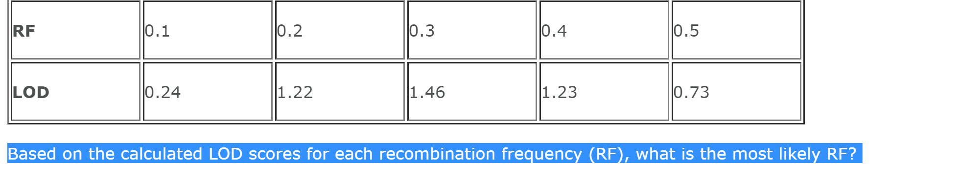 Based on the calculated LOD scores for each recombination frequency