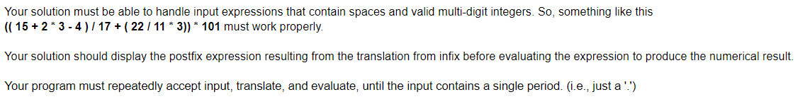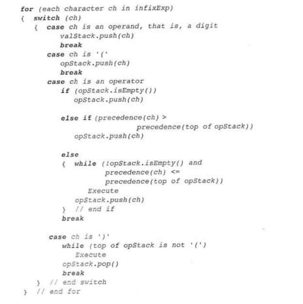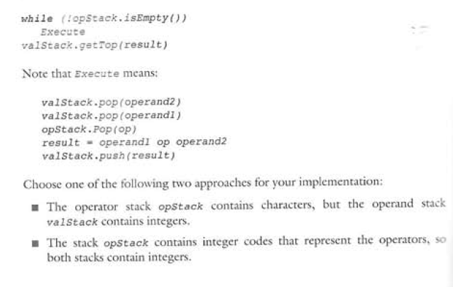 Use the below algorithm to evaluate an infix expression infixExp. The algorithm uses two stacks. One stack opStack contains operators, the other stack valStack contains values of operands and intermediate results. (Note the algorithm treats parenthesis as operates with the lowest precedent)