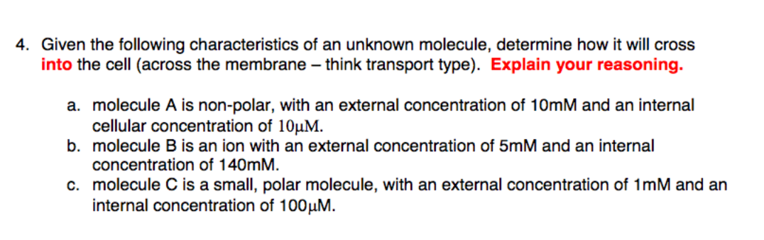 Please completely and accurately answer the below Cell Biology question. Explain all reasoning for the transport type chosen for each molecule.