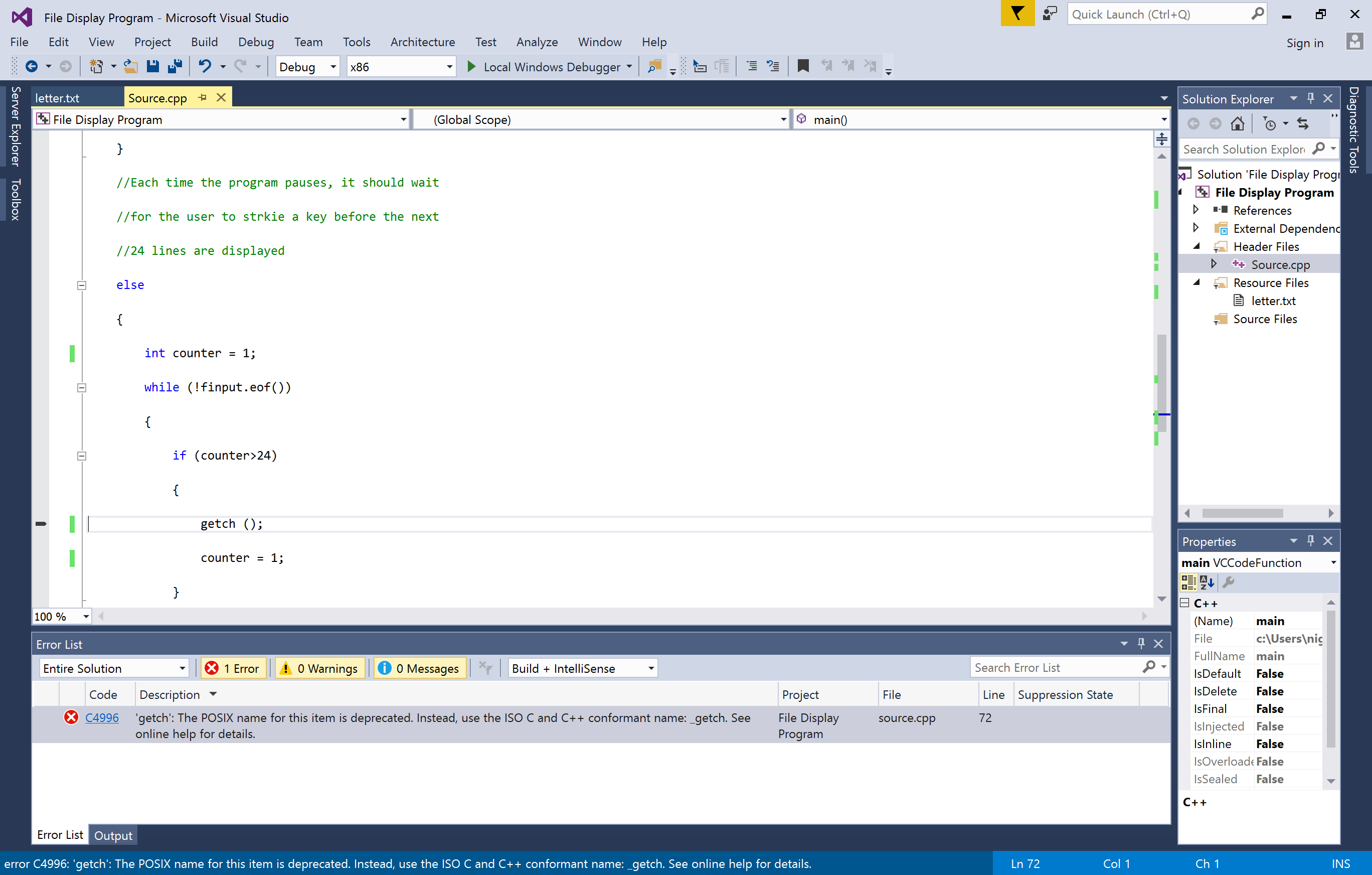 When I want to compile the project on Visual Studio it shows an error saying that getch(); is deprecated. The code is following the steps of the programming challenge or may I have a different solution?