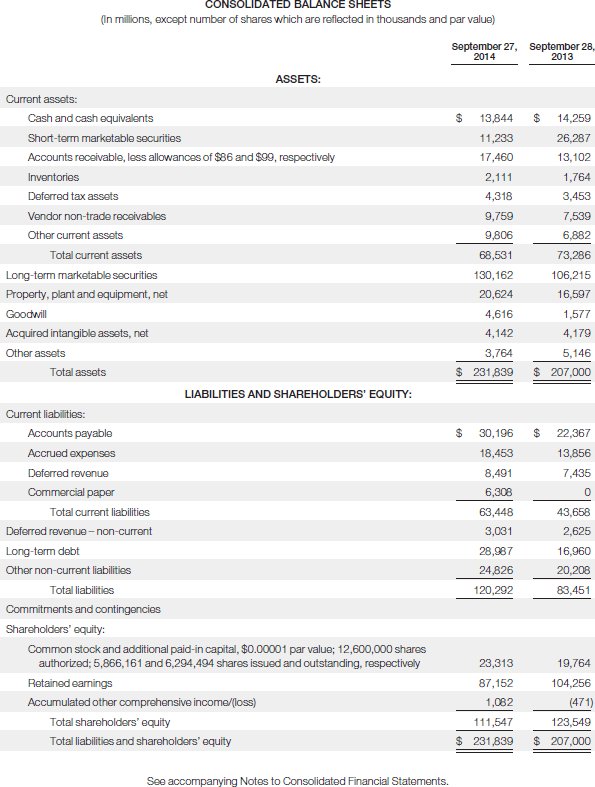 (d) From your analysis of the September 27, 2014, statement of cash flows, was the change in accounts receivable a decrease or an increase? Was the change in inventories a decrease or an increase? Was the change in accounts payable a decrease or an increase?
