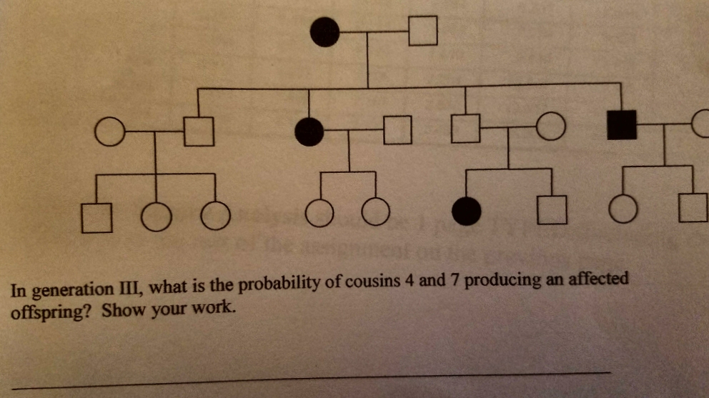 In generation III, what is the probability of cousins 4 and 7 producing an affected