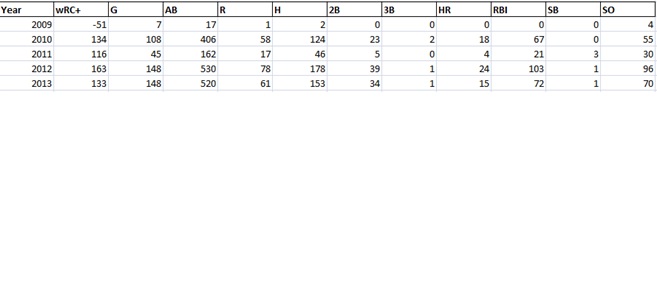 See the associated dataset for the case, “DataScience_7_Case_Posey.xls”. The screenshot below shows a portion of the data. It shows Buster Posey’s batting performance from 2009 (the year he started with the Giants) to 2013.