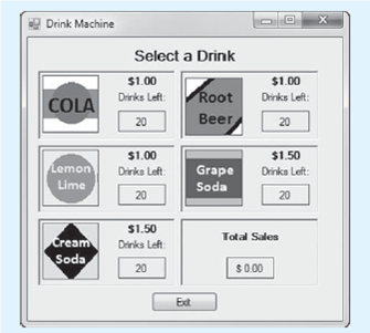 When the application starts, the vending machine will have 20 of each type of soft drink. Each time the user selects a drink, the application should subtract 1 from the quantity of the selected drink. It should also update and display the total amount of sales. If the user selects a drink that is sold out, a message should be displayed indicating so.