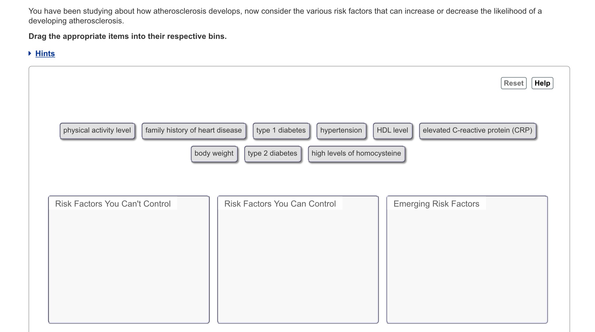 Risk Factors for Atherosclerosis: Categorize the following factors into the following 3 categories