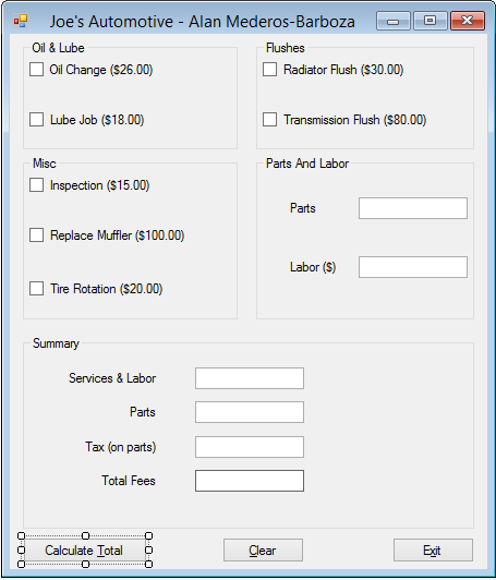 Joe also performs other nonroutine services and charges for parts and labor ($20 per hour). Code an application that displays the total for a customer's visit to Joe's. The form should resemble the one shown in Figure below.