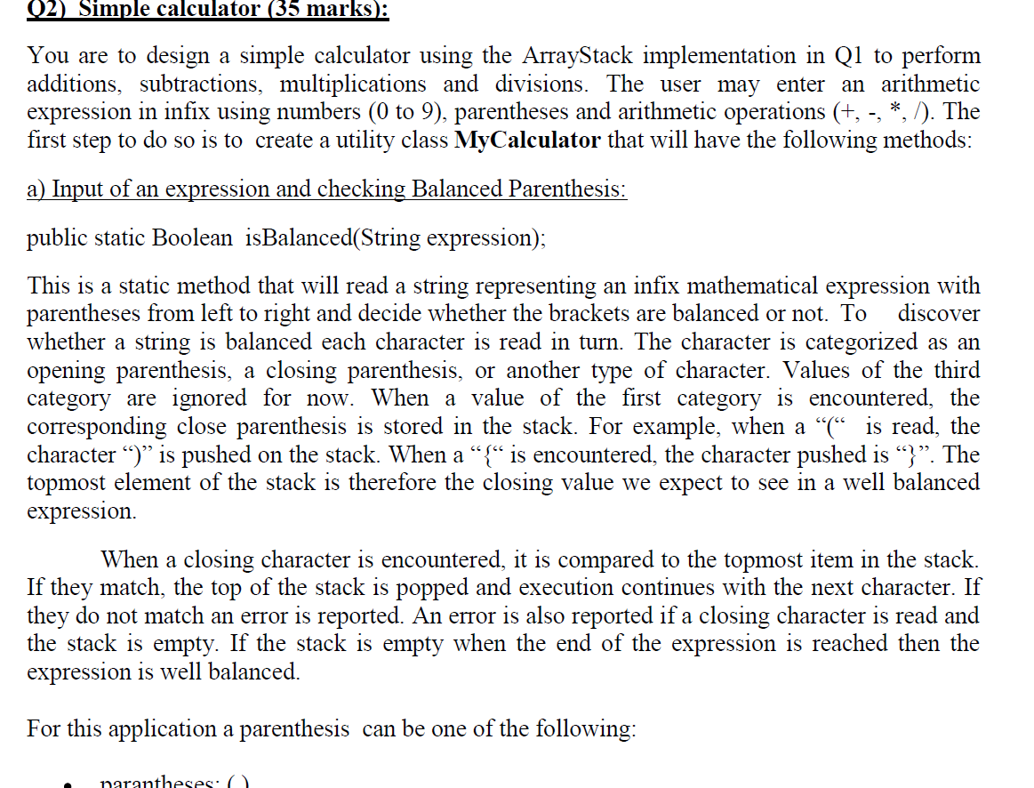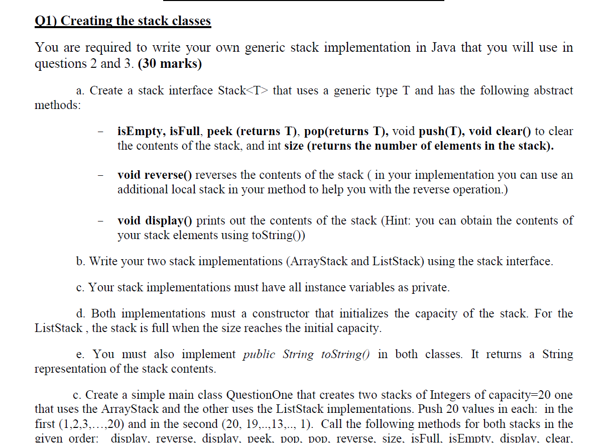 You are required to write your own generic stack implementation in Java that you will use in questions 2 and 3. (30 marks)