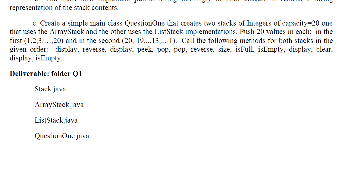 c. Create a simple main class QuestionOne that creates two stacks of Integers of capacity=20 one that uses the ArrayStack and the other uses the ListStack implementations. Push 20 values in each: in the first (1,2,3,...,20) and in the second (20, 19,..,13,.., 1). Call the following methods for both stacks in the given order: display, reverse, display, peek, pop, pop, reverse, size, isFull, isEmpty, display, clear, display, isEmpty.