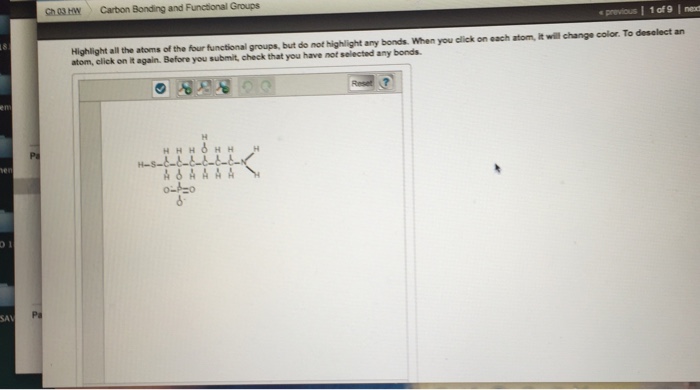 Highlight all the atoms of the four functional groups, but do not highlight any bonds. When you click on each atom, it will change color. To deselect an atom, click on it again. Before you submit, check that you have not selected any bonds.