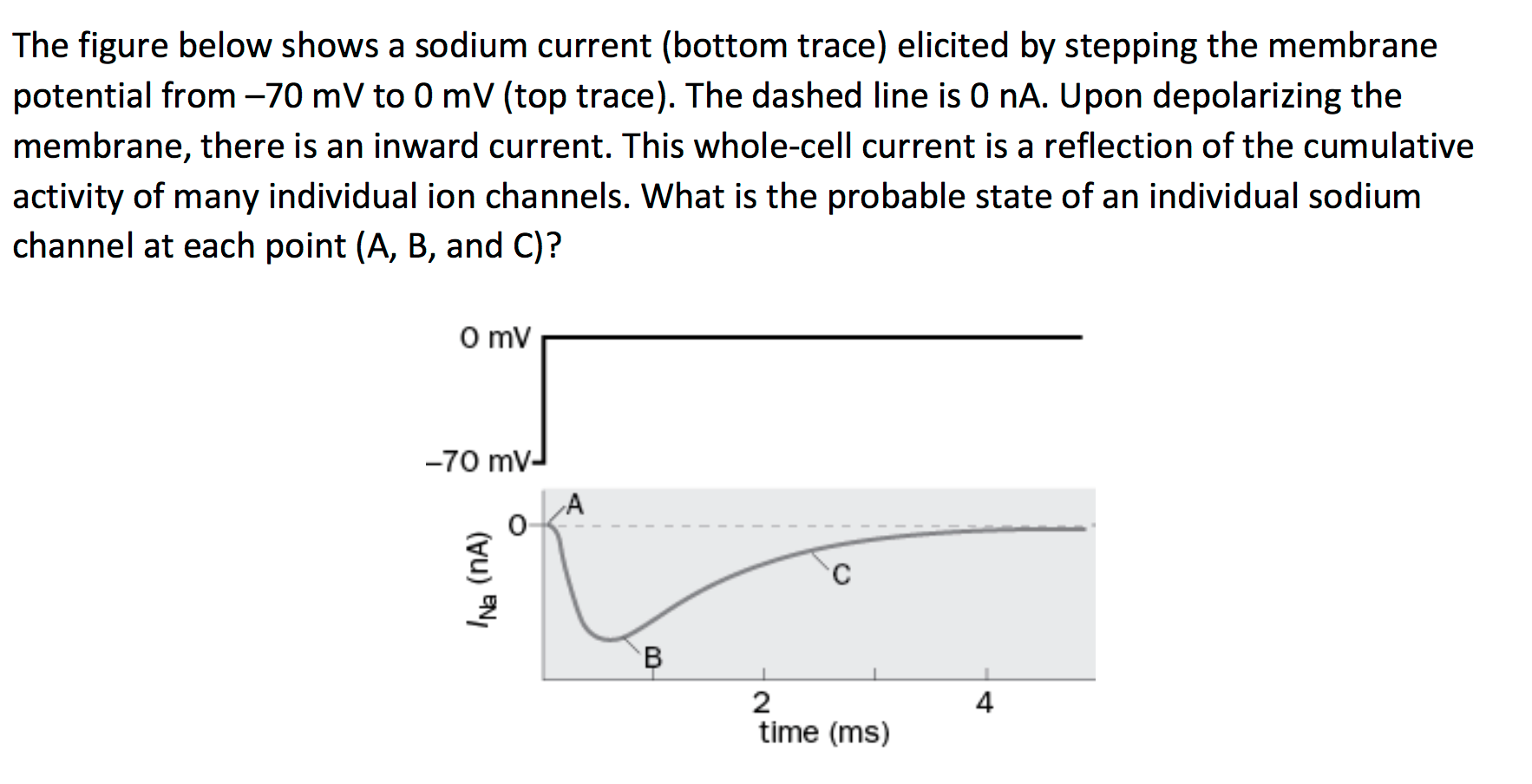 1. The figure below shows the response of a single Na+ channel patch clamp recording. Which individual ion channel state best describes the current in A, B, and C?