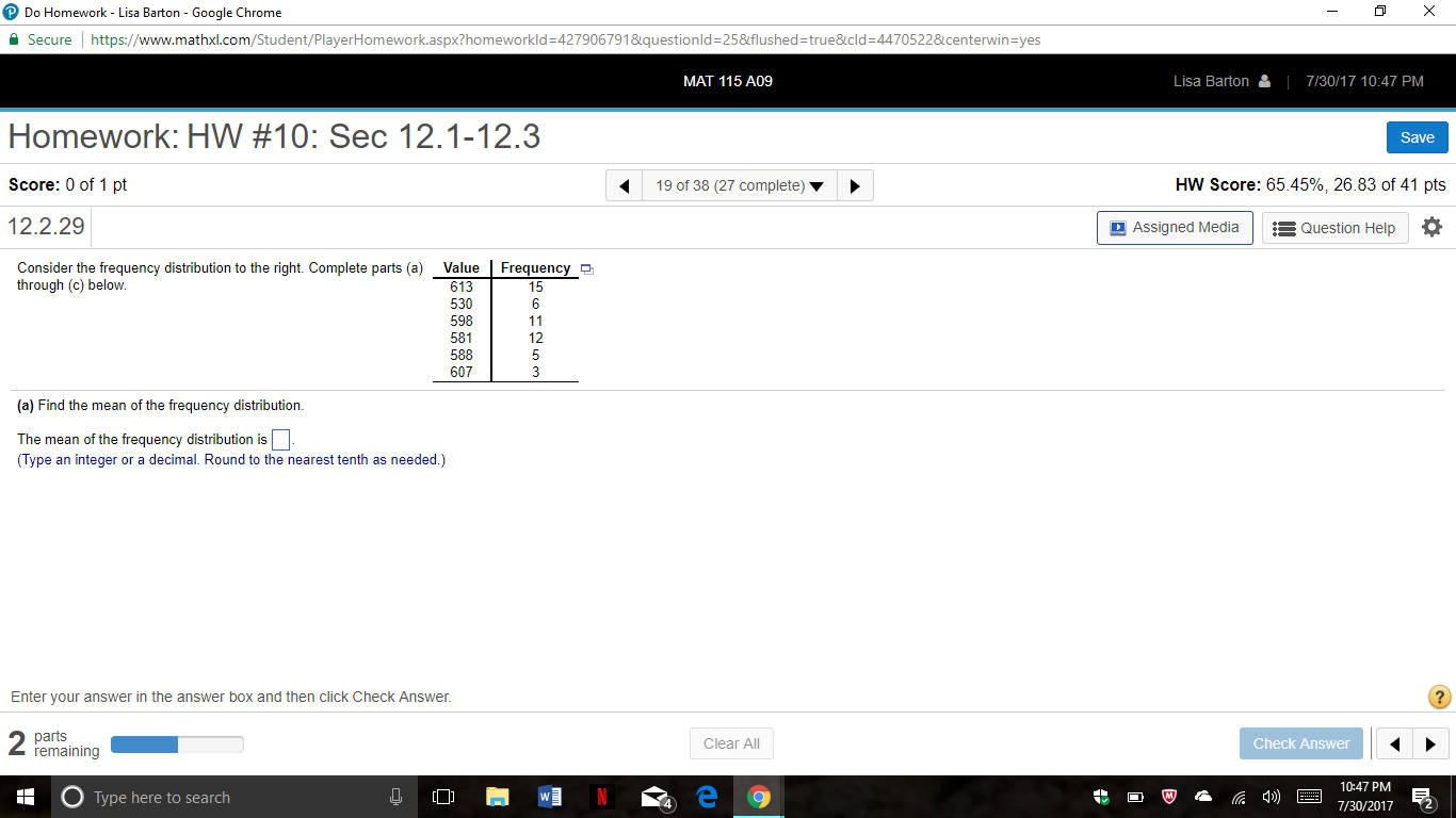 Do Homework , Lisa Barton , Google Chrome — X 9 Secure I hiipsu’jwwwmathxlxomfistudent/PiayerHomework.aspx?homewori<ld=427906?91&questionld=25&flushed=lrue3tc|d=44705223Lcenterwm=yes MAT 115 A09 Homework: HW #10: Sec 12.1-12.3 Score: 0 0H pt 1 19 0138 (2? compiete)v y HW Score: 65.45%. 26.83 of 41 pts
