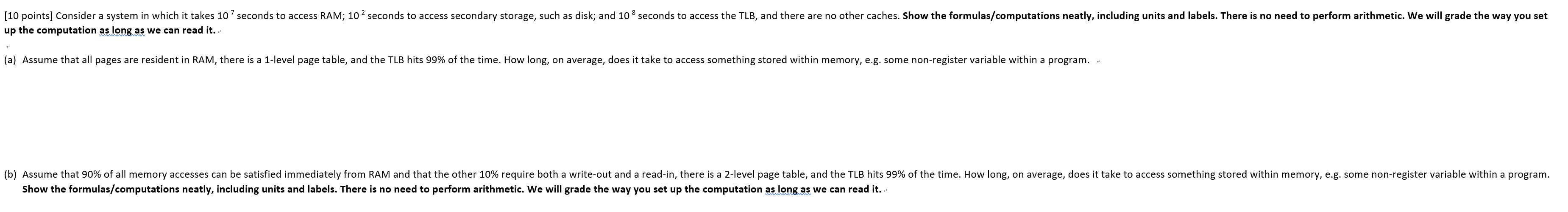 [10 points] Consider a system in which it takes 10" seconds to access RAM; 10'2 seconds to access secondary storage, such as disk; and 10‘ seconds to access the m, and there are no other caches. show the lormulas/oomputniona n tly, including units In»! Ielao .Thm is no n d to perform arithmetic. We will grade the why vnu set