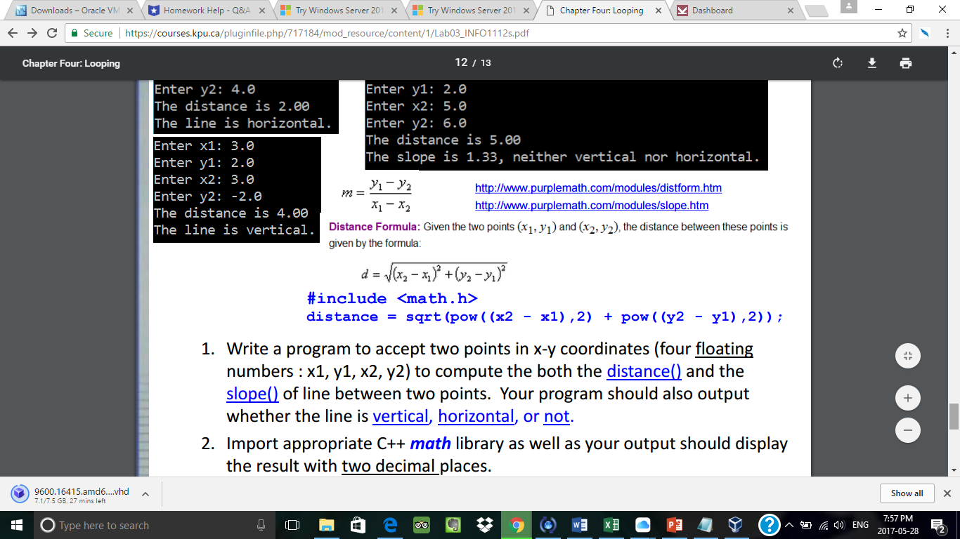 write a program using c++ to calculate distance and slope of line between two points and also display whether its horizontal or vertical .