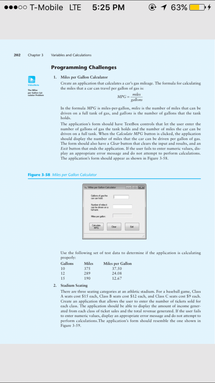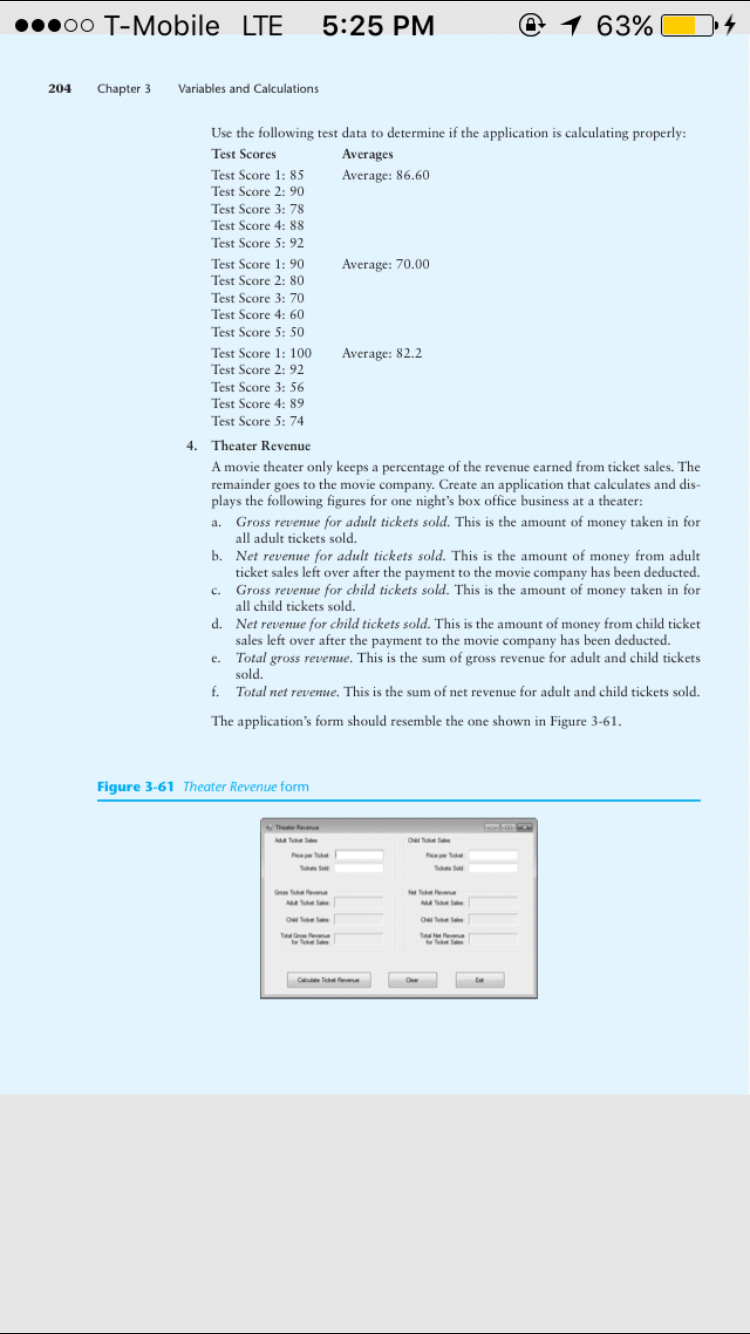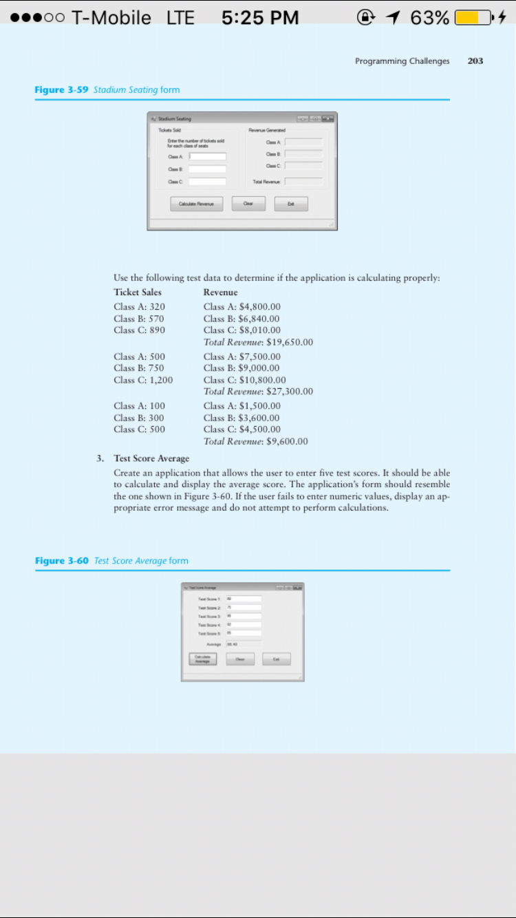 Create Visual Basic projects to solve Programming Challenges 2, 3, and 4 on pages 202 through 204 at the end of chapter 3 of the Visual Basic textbook.Â