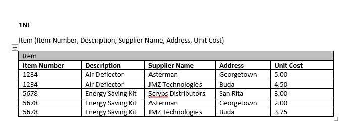 I'm struggling with normalizing a given data table, specifically how to get from 2NF and 3NF with the data given. In all the examples I have looked up online, their 3NF looks more like my 2NF. I have attached the original given data that needs to be converted, and what I came up with for 1NF and 2NF (I haven't gotten to 3NF - this is where I'm stuck). What am I missing?